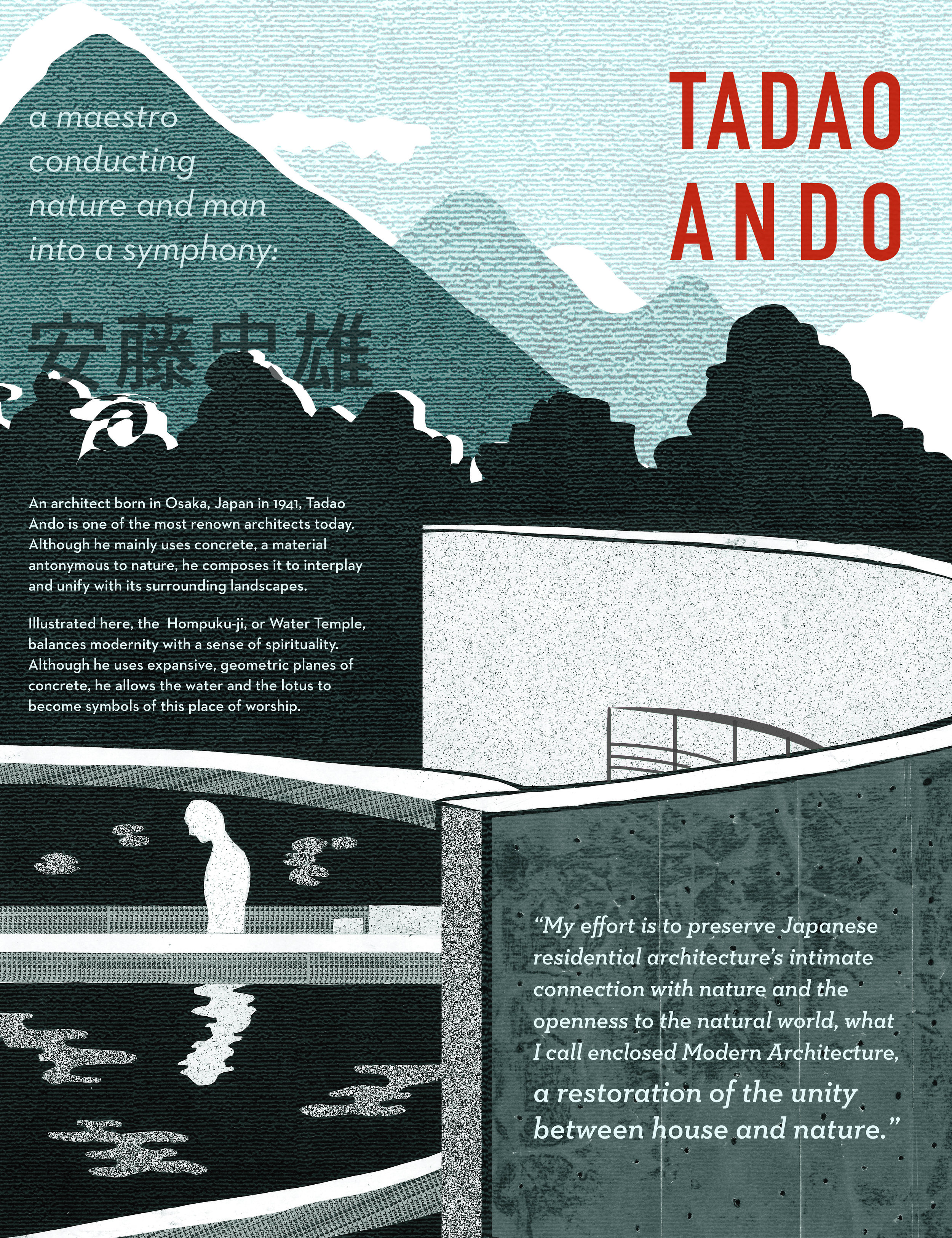 안도 다다오가 1976년에 지은 스미요시의 연립 주택(住吉の長屋)은 70년대의 일본식 주택들과는 전혀 다른 스타일이었다. 그 다름을 강조하기 위해 사진과 종이 꼴라주 방식을 함께 썼다.